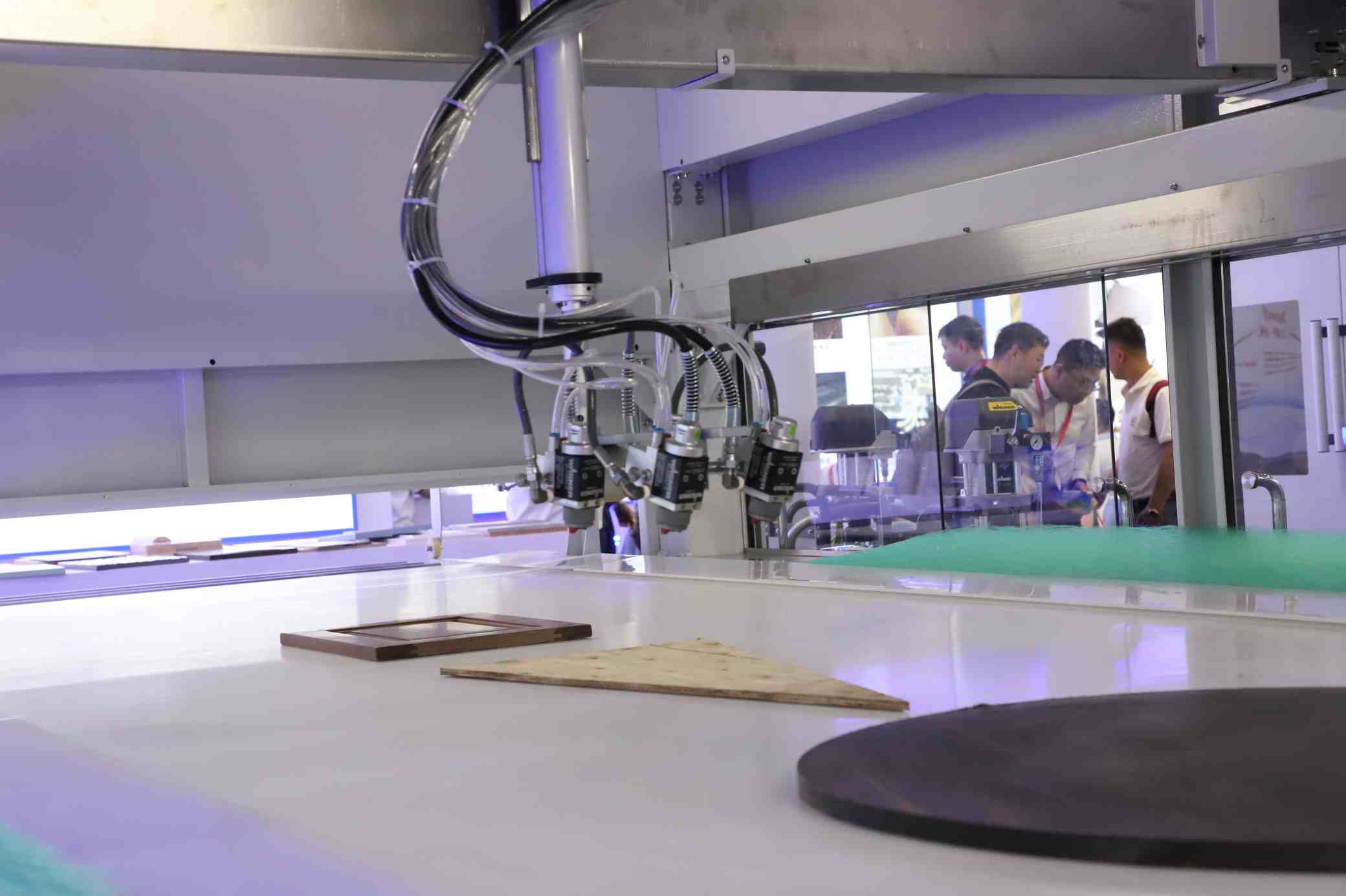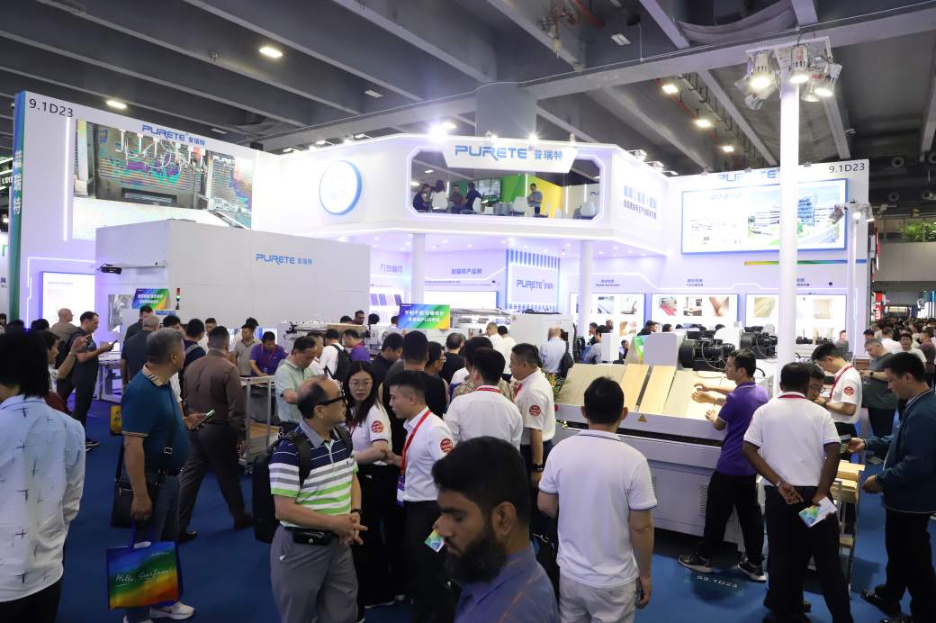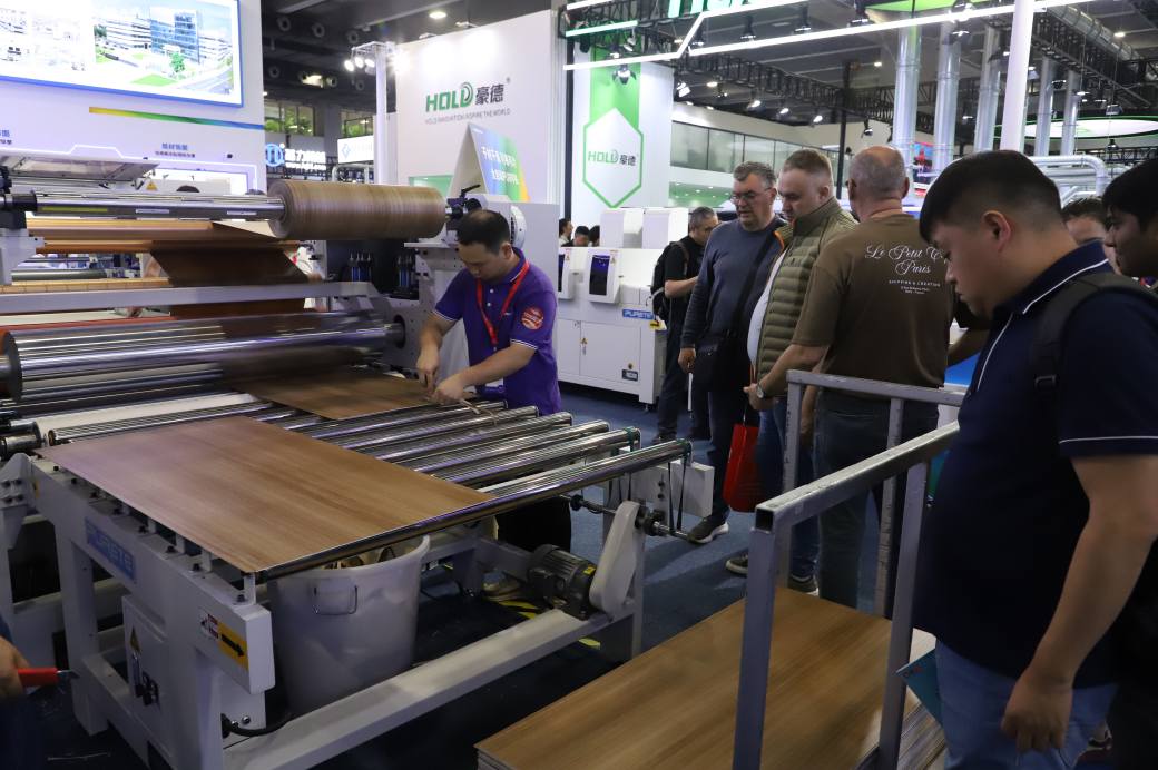 展现了极速而平稳的贴面工艺。高效的自动化流程不仅大幅提升了产能,更保证了板材表面的平整度与完美质感,直击家居制造的效率痛点。
