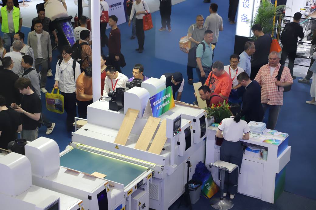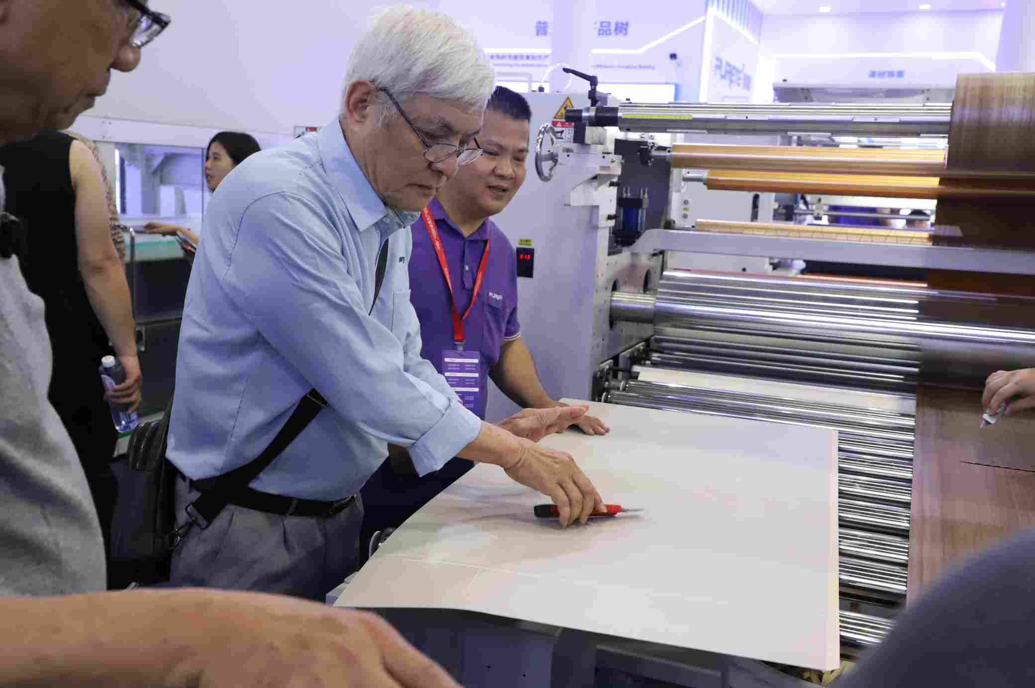 针对实木及木皮材质的特性,现场演示了均匀细腻的辊涂效果。设备在保留木材自然纹理的同时,赋予了其更出色的保护层,展现了普瑞特在精细化表面处理上的深厚功底